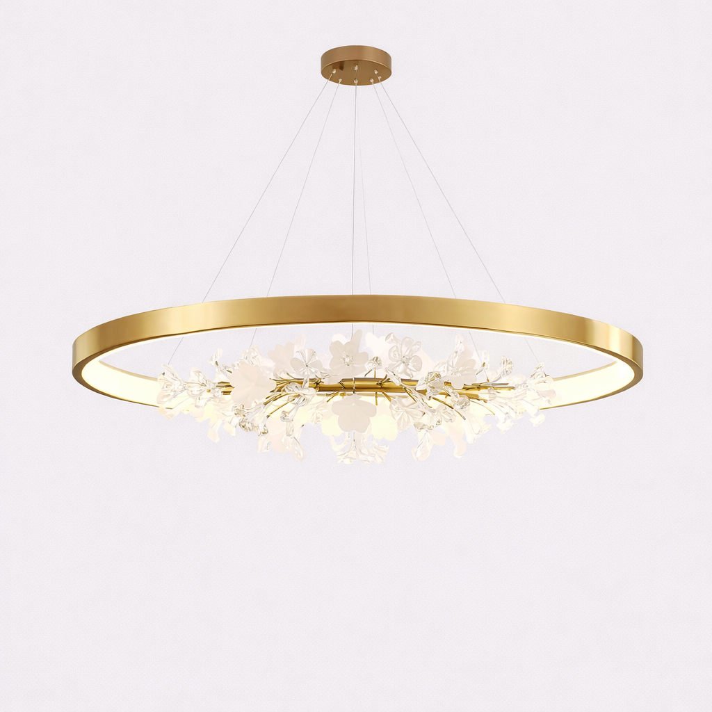 Crafted from durable iron with glass accents, this chandelier features a slim oval ring design that provides evenly diffused light, creating a sophisticated focal point without overwhelming the space.