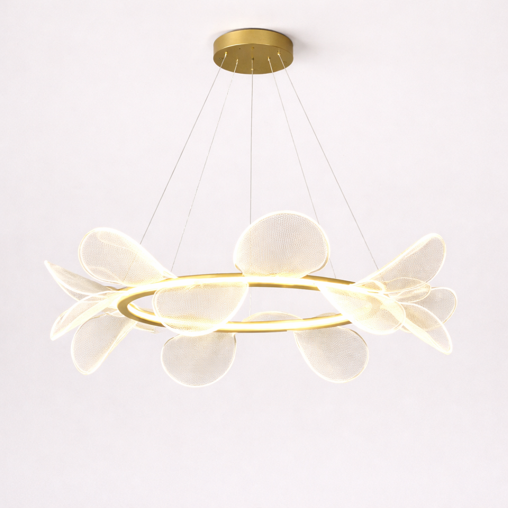 Crafted from a refined blend of iron, aluminum, and acrylic, this chandelier features a floral-inspired sculptural form that diffuses light beautifully while offering adjustable hanging height for flexible installation.