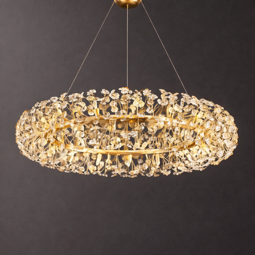 Crafted from durable iron with shimmering crystal elements and a refined gold finish, this chandelier offers brilliant light diffusion and visual depth, enhanced by an adjustable hanging line for flexible installation.
