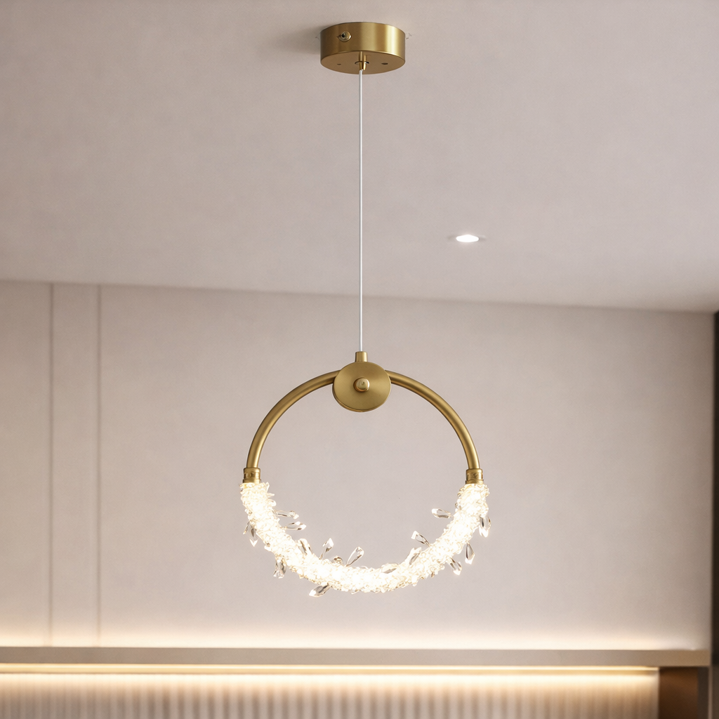 Crafted from iron and crystal with a refined circular design, this pendant light delivers a warm, decorative glow while offering adjustable hanging length for flexible installation.