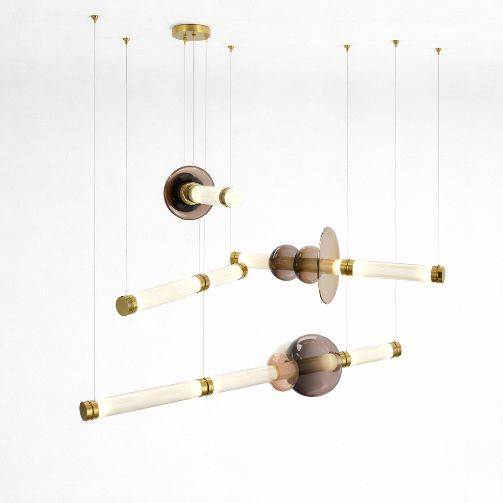Crafted from premium aluminum with glass globe accents, this chandelier features a sophisticated multi-drop design with varied hanging lengths, creating depth, movement, and a refined visual statement ideal for high ceilings and feature spaces.